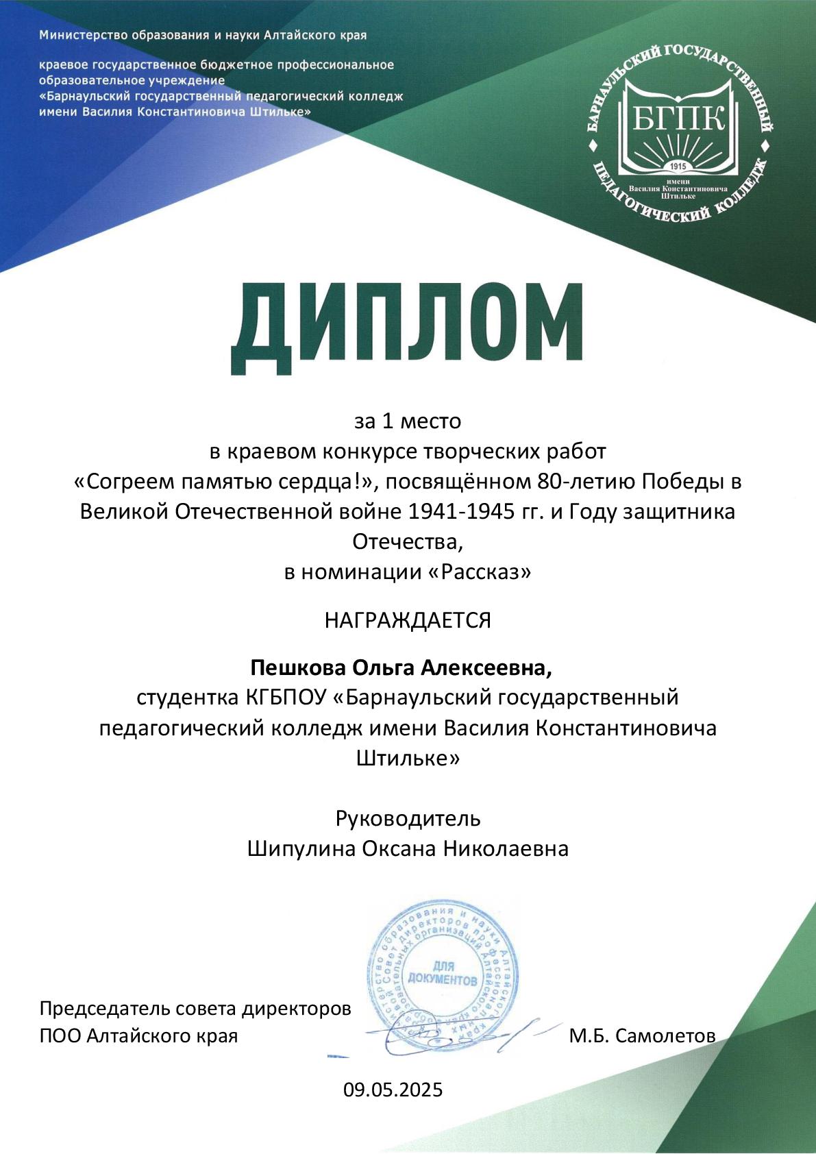 В соответствии с планом работы Алтайского регионального отделения Российского Союза писателей и Совета директоров профессиональных образовательных организаций Алтайского края с 10.02.2025 по 30.04.2025 г. проводился краевой конкурс творческих работ «Согреем памятью сердца!», посвящённый 80-летию Победы в Великой Отечественной войне 1941-1945 гг. и Году защитника Отечества.